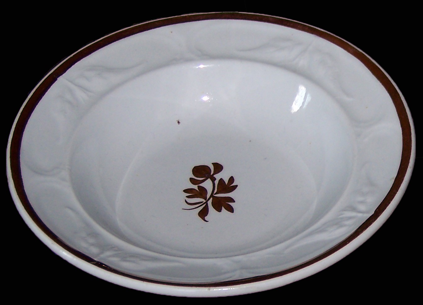 These small nappies are embellished with embossed fuschia leaves around the rims.  Note that this piece is not marked.