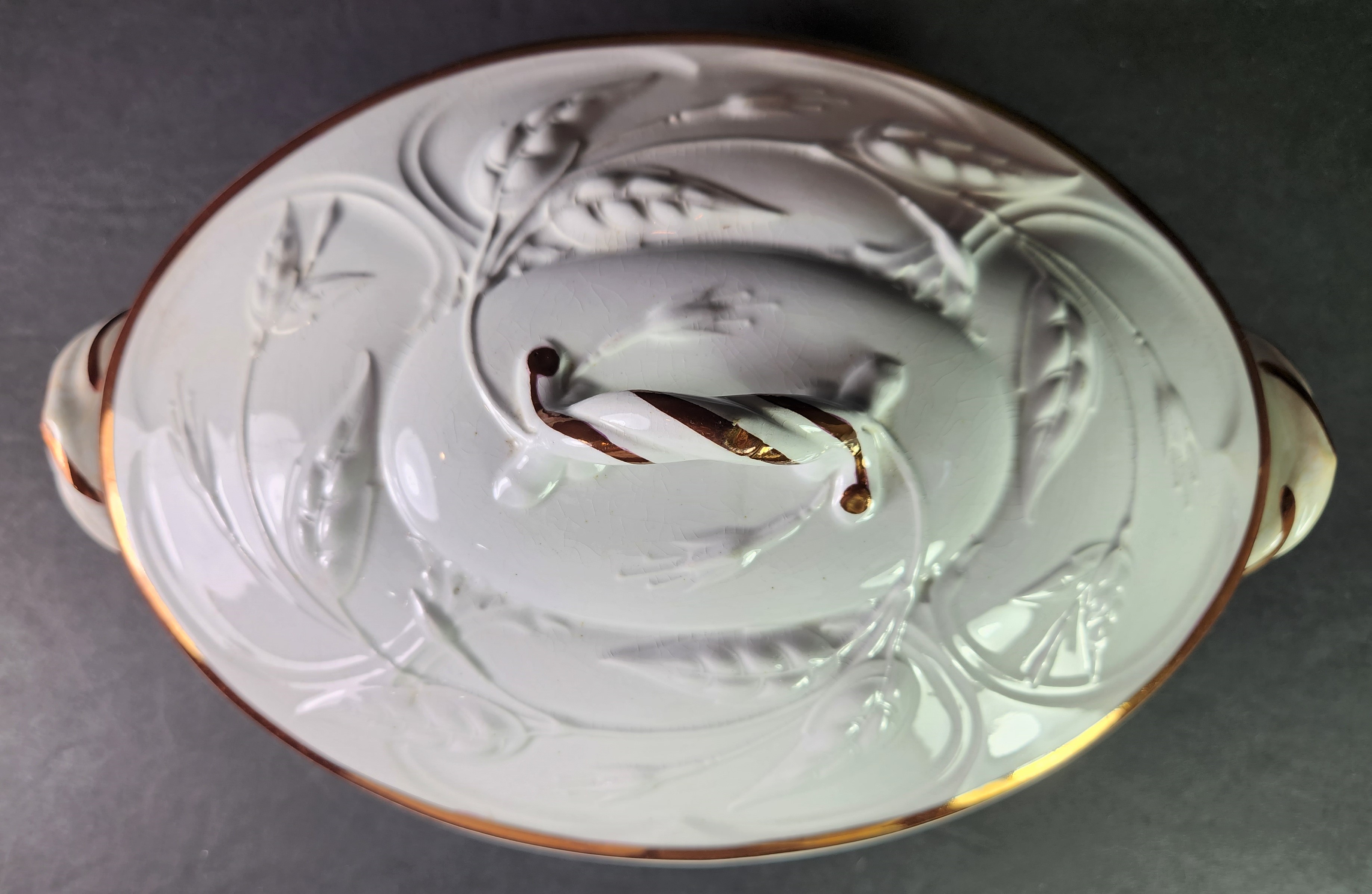 The view of the intricate embossing on top of a Bordered Fuchsia vegetable lid.