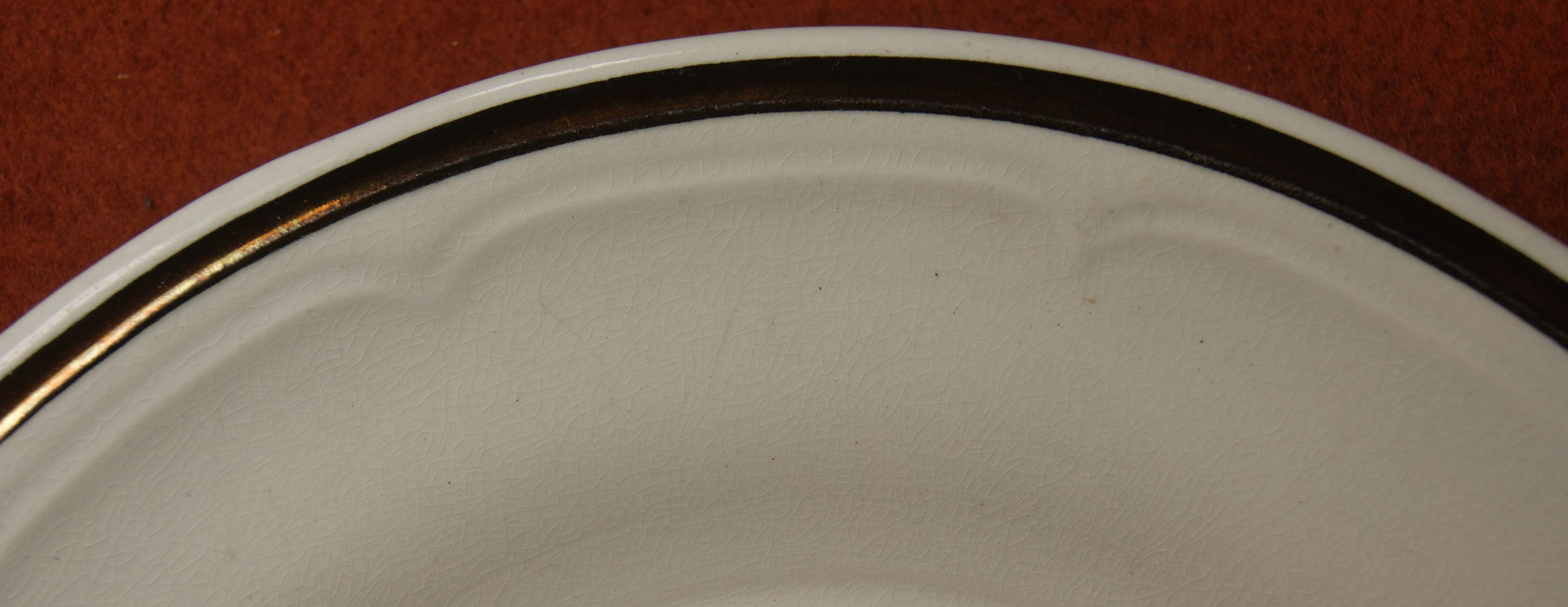 Crescent arches embossed near the top rims of holloware and flatware pieces identify this body style. It is usually found with only banding but examples with teaberry motif are known. The impressed oval mark verifies that the potter's name for this body style is Augusta Shape. Many pieces are found simply marked "J. Clementson, Sheldon."