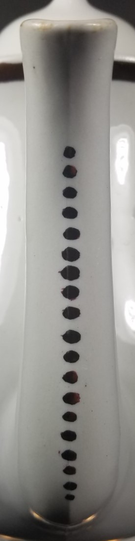 The simple lines of this bulbous round style are relieved by the bands of beads found at the handle arch and on the finial. Dressed up with a bold teaberry motif, it has a plain but pleasing look.