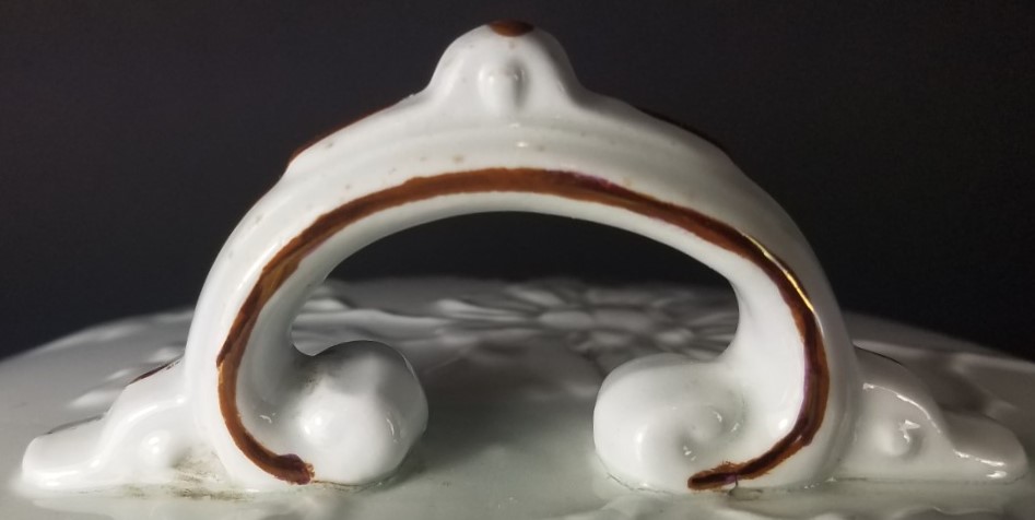 Chrysanthemum features lavish floral embossing on the upper body. This late Victorian bulbous style may be found in copper or gold lustre motifs.