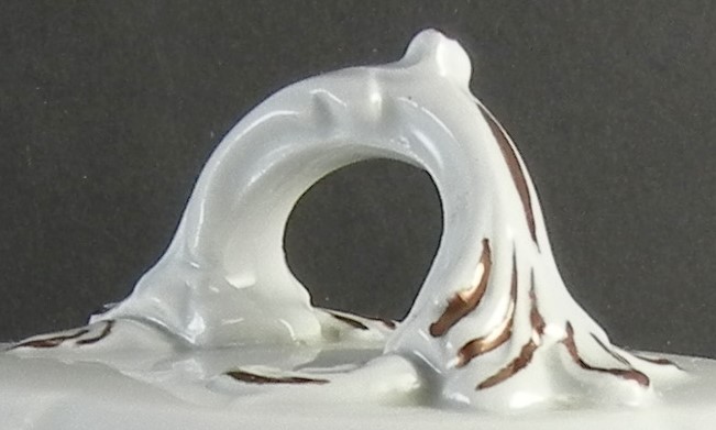 The circular arch finial and C-shaped handles are other attributes on holloware pieces.