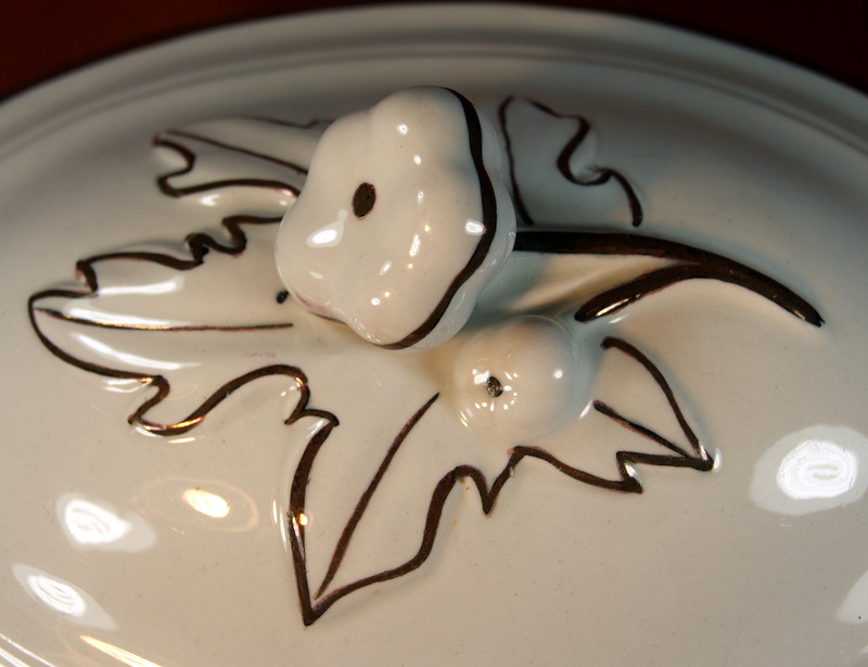 The lavishly embossed Lafayette Shape was a name that would appeal to the average housewife. Strangely, the plates and platters in this body style are plain in conrast to the hollowware pieces.