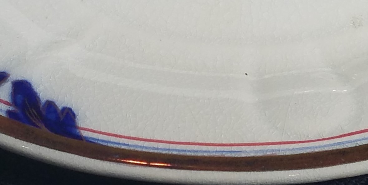 Copper Lustre, Copper Lustre with red and blue pinstripes and cobalt plumesFootprints/Shapes: