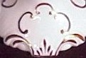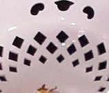 The only piece known to this body style is the reticulated compote. It's a beautiful body style with heavy embosing and reticulated cut outs highlighed with copper lustre and reminiscent of a lace doily. Hence, this is how the body style was named.