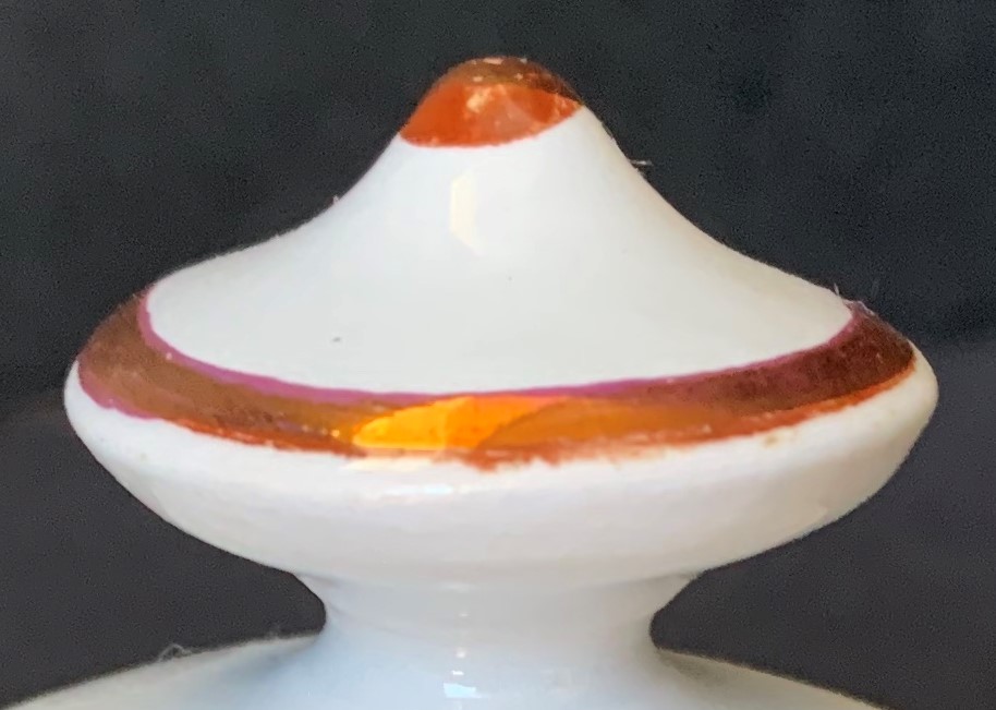 The classic lines of this tapered round ware inspired the name "Rondeau." The name is particularly suitable, as in classic poetry and music, a Rondeau features a repeated line. Davenport's Rondeau carries this theme out with the wide and narrow copper lustre bands rimming flatware pieces and the rim and collar bands on hollowware pieces.