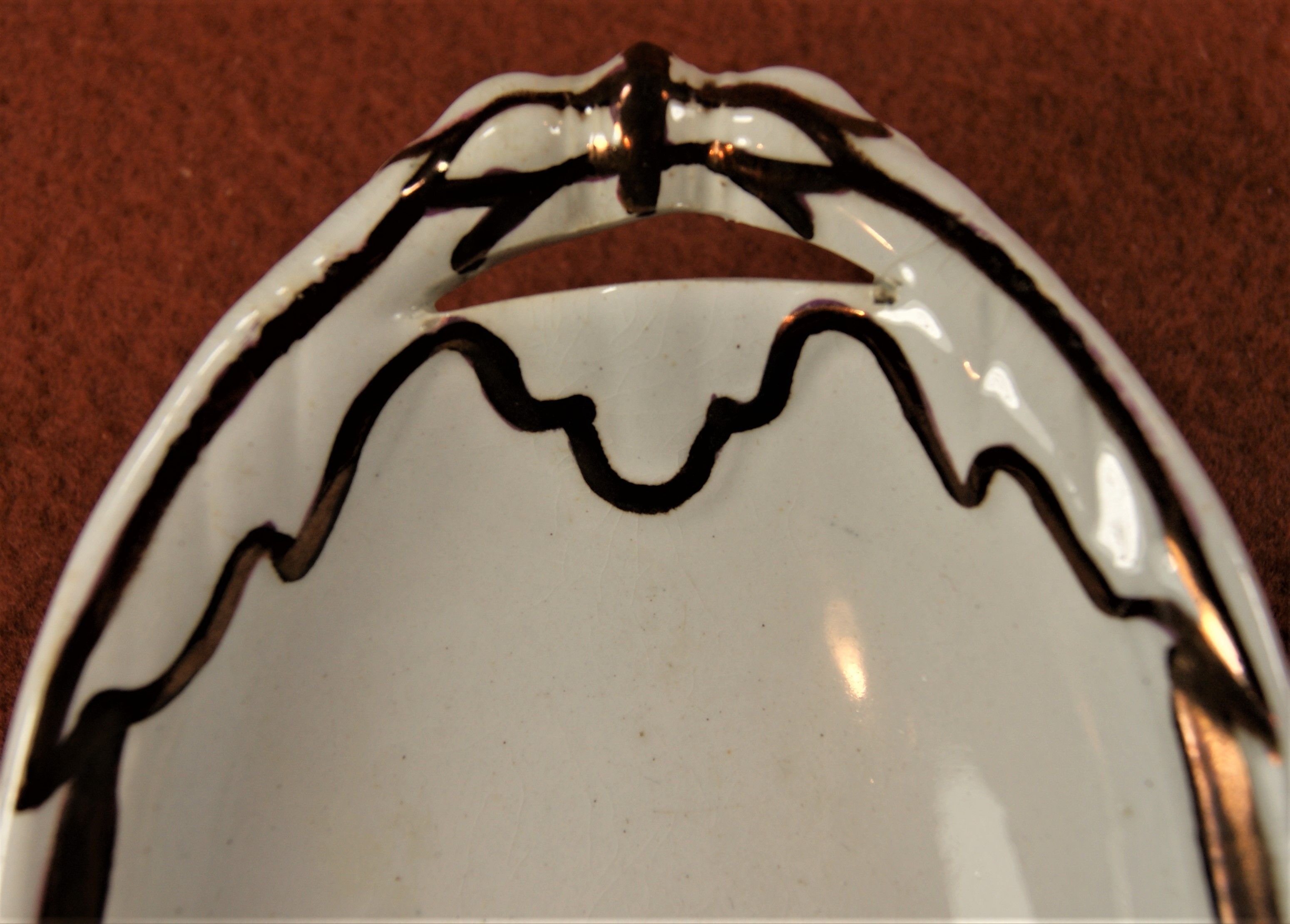 A charming variation of the Plain Round styles of the 1870's, Anthony Shaw used lavish copper lustre decoration at the handles and finial surrounds. The uplifted handles are molded with a tied bow seen both on sugar bowls and on pickle/relish dishes. The medallion arch typ[e finial seems out of keeping with this style of handles. Creamers have a slightly scalloped rim and high spout, very similar to Shaw's Cable and Ring body style.