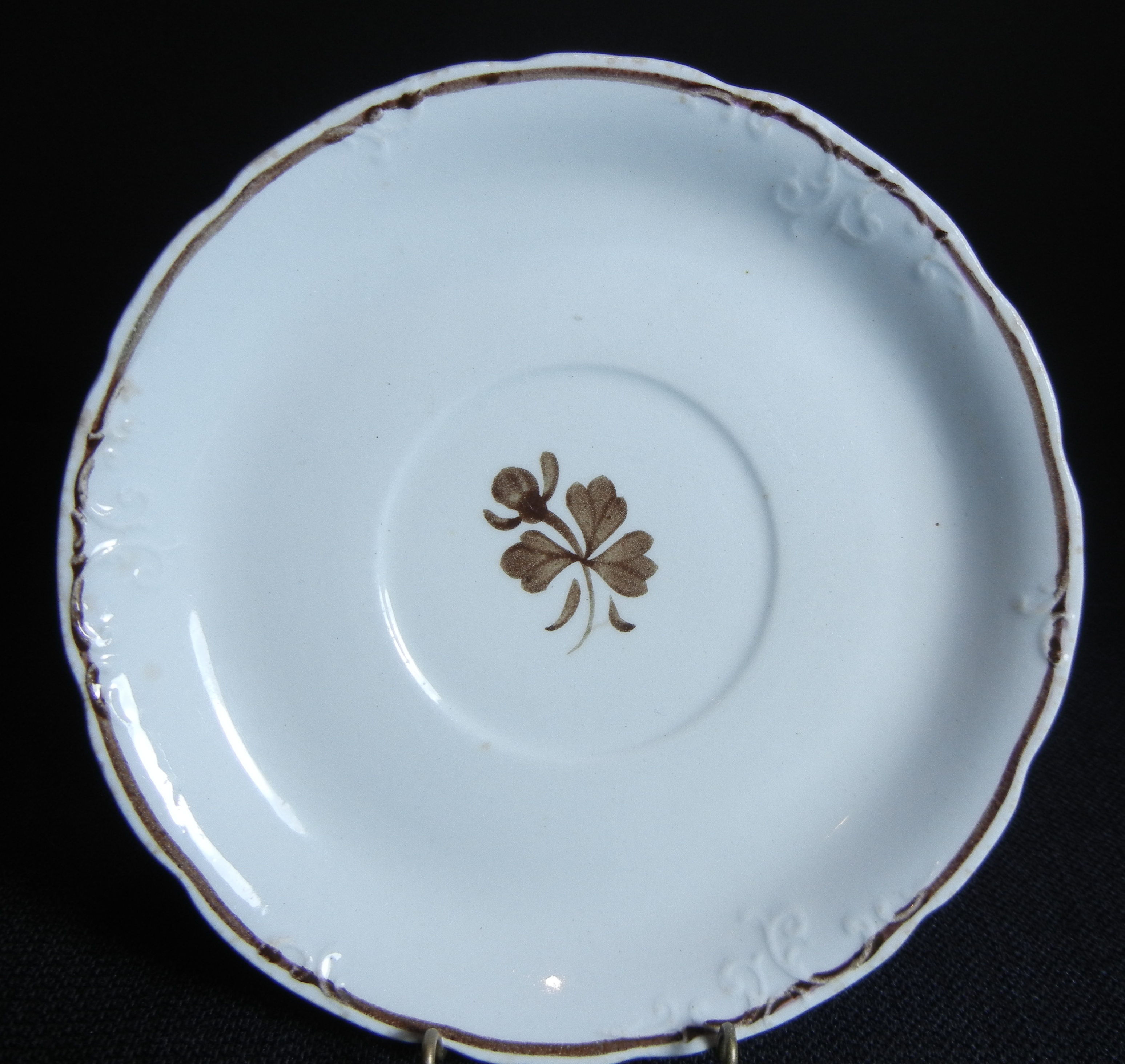 A saucer in the Crewel body style. Notice the embossed design around the rim that resembles fine crewel embroidery.