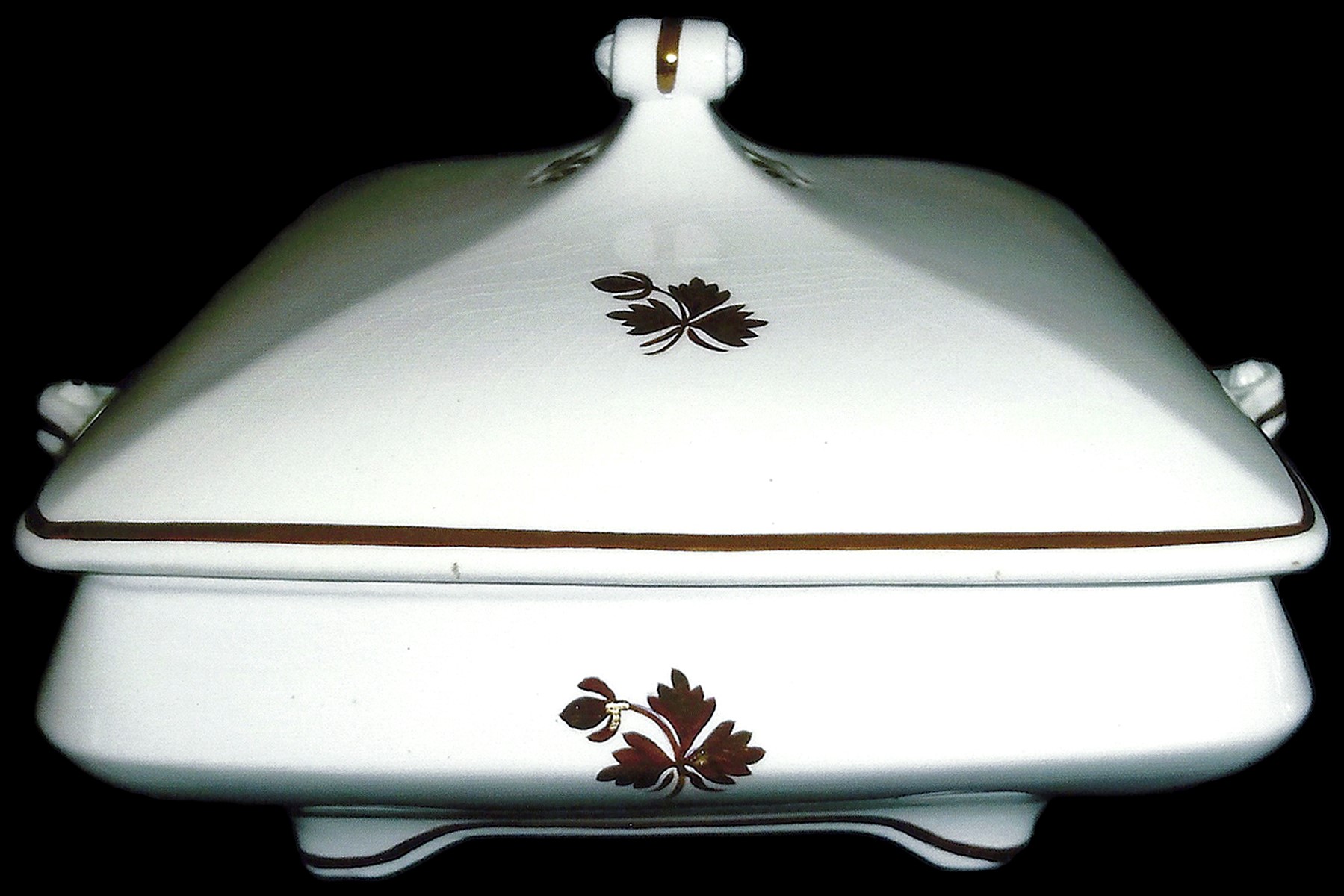 A vegetable tureen in an unusual square shape.
