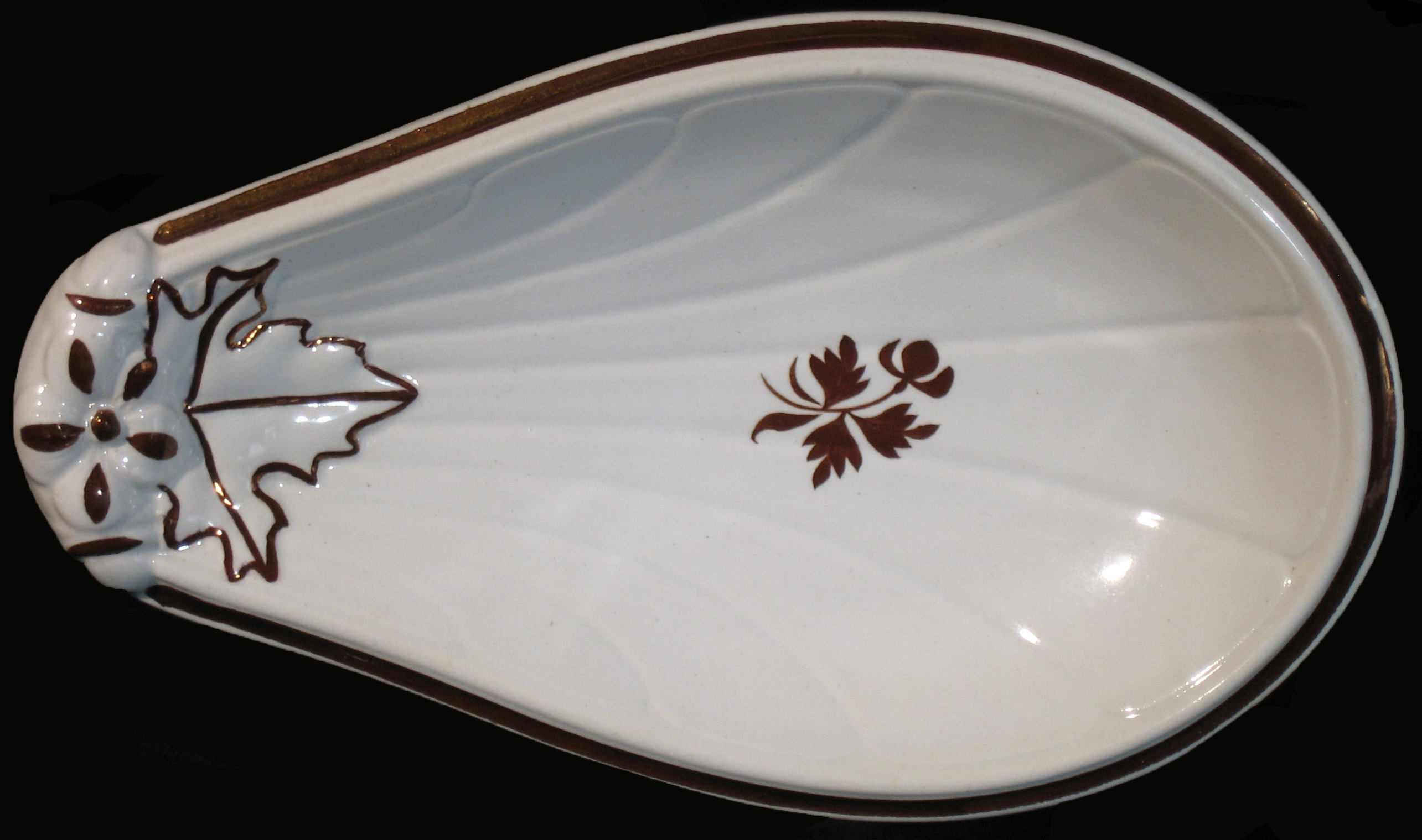 Notice the leaf embossing at the handle terminals of this pickle or relish dish.