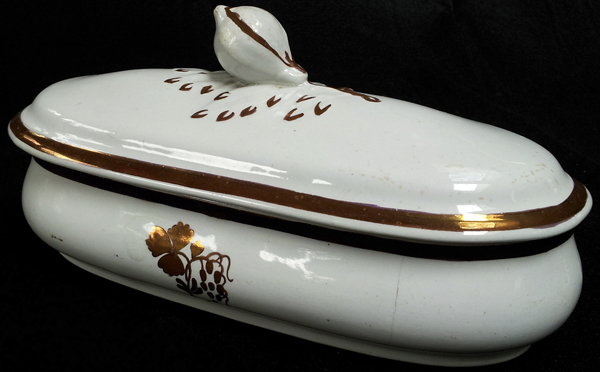 A covered horizontal container for brushes or razors.