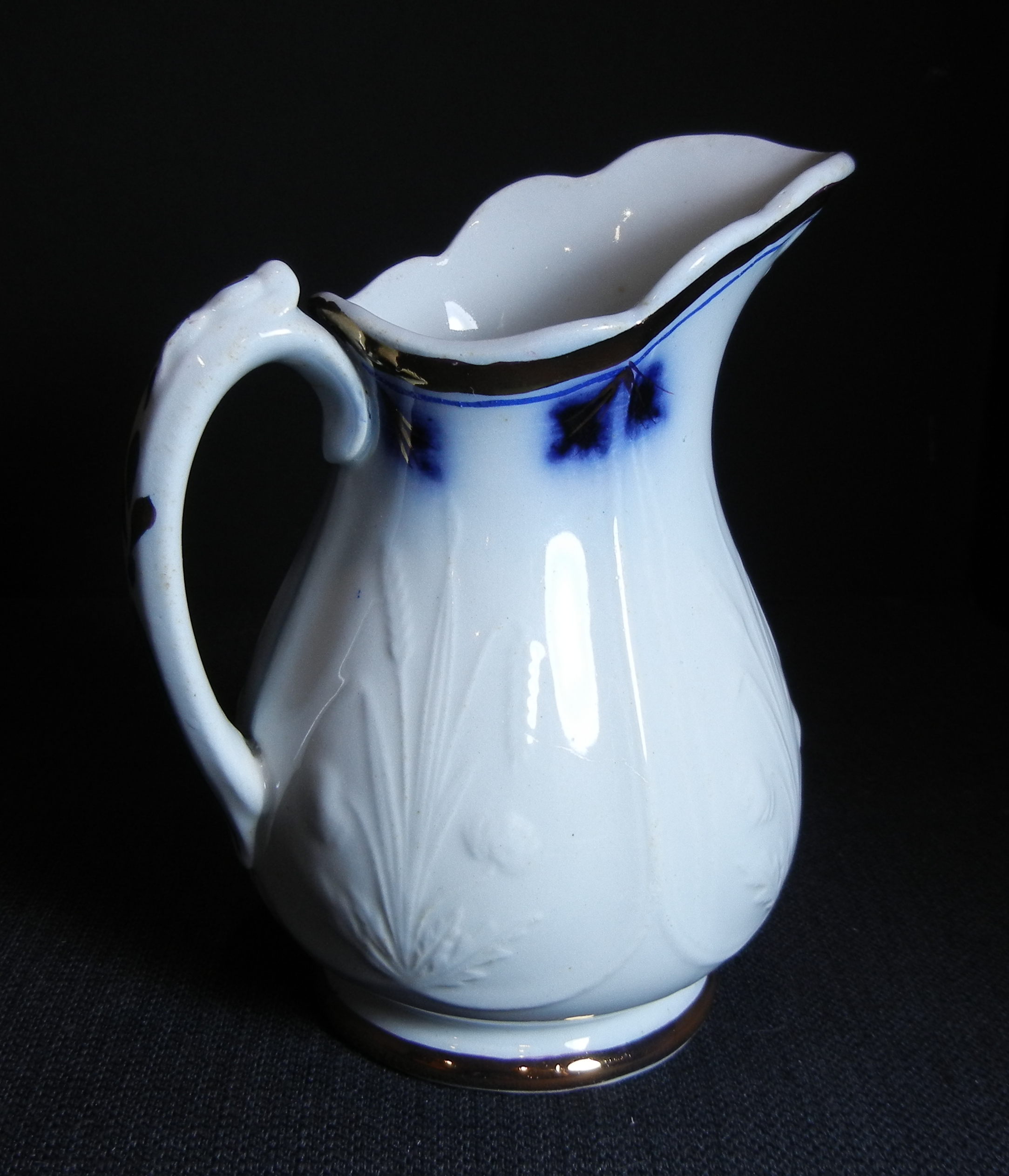 This Praire Shape pitcher is embossed with wheat sheaves and poppies and embellished with copper lustre and cobalt plumes.