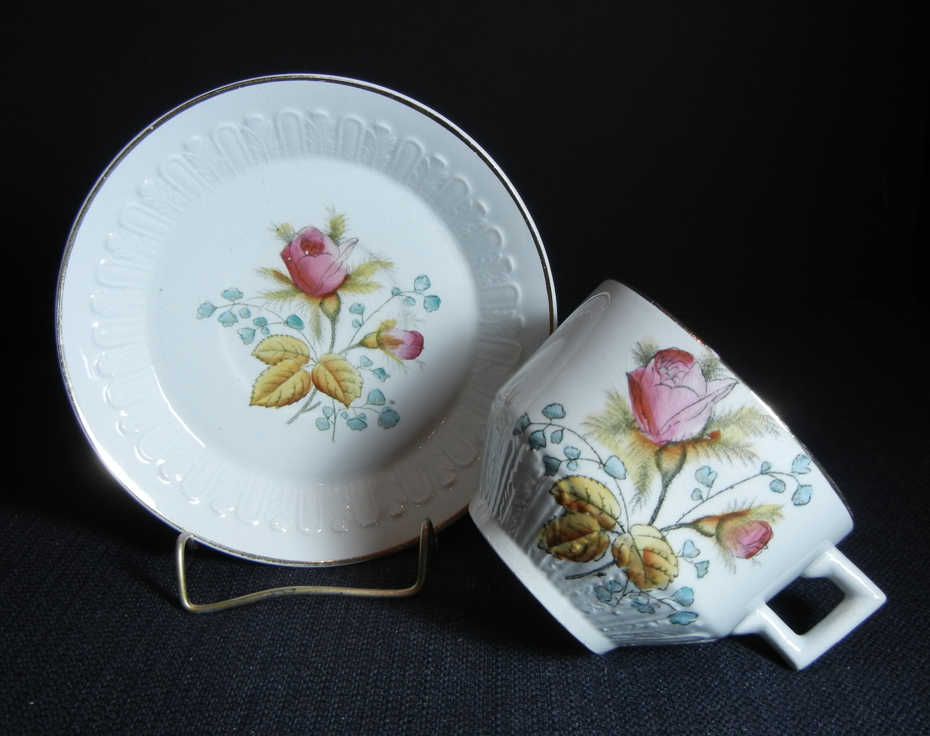 The feather-like embossing on the base of the cup and on the rim of the saucer is crisp and distinct. A beautiful example of the Peerless body style.