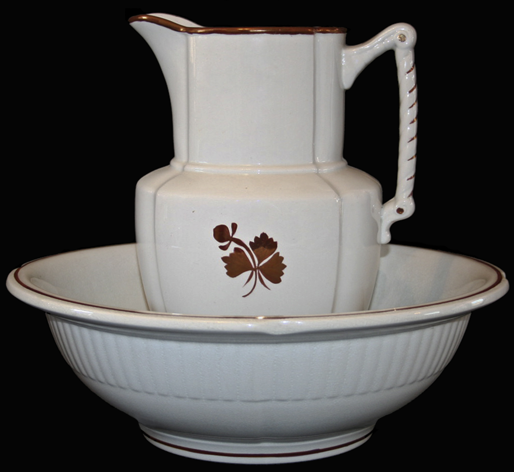 A large basin (wash bowl) and ewer (pitcher) to be used for personal hygiene. A ewer is generally 10 to 12 inches tall.