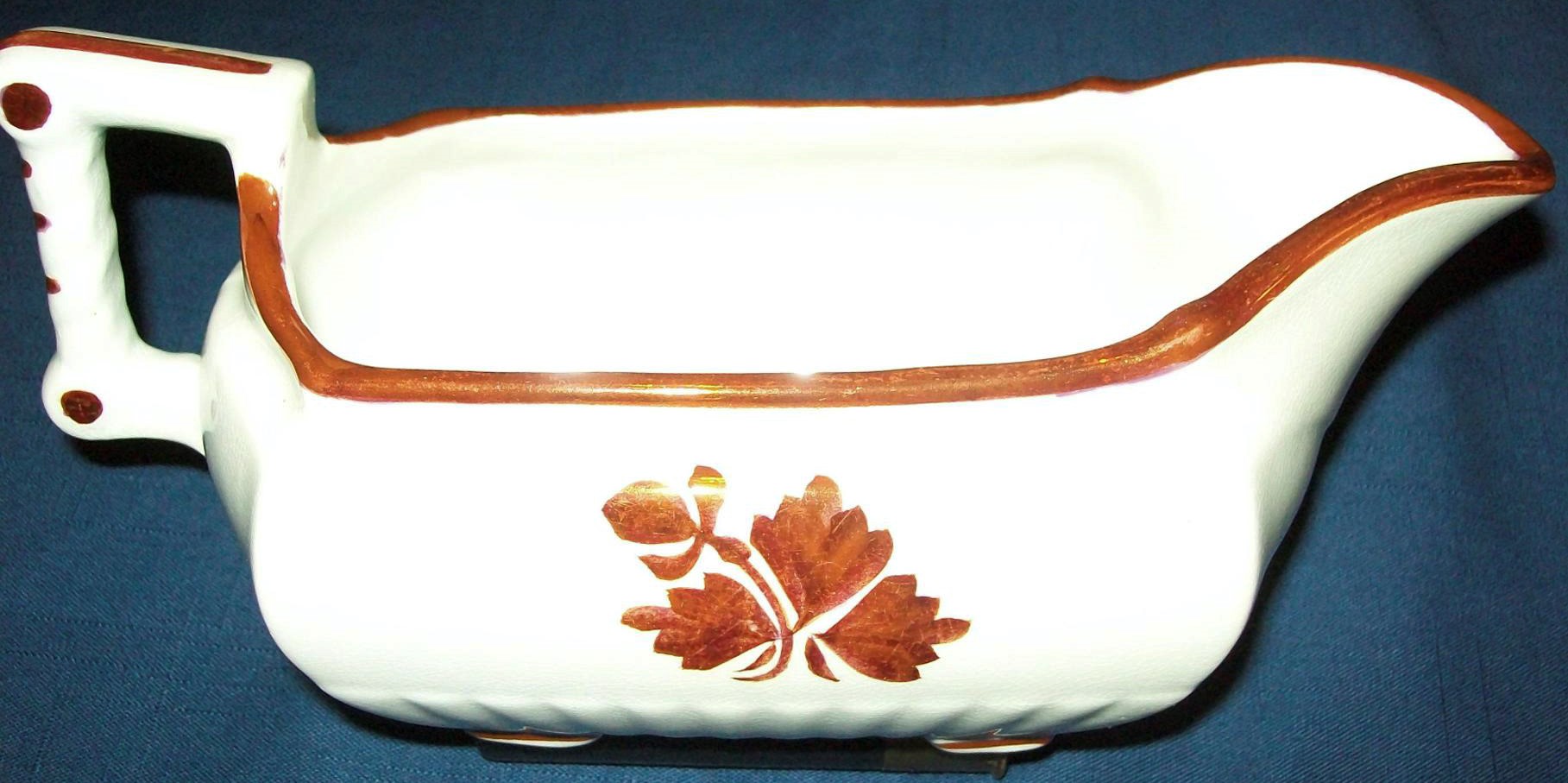 A gravy boat in the Favorite body style. Notice the handle that resembles twined rope.