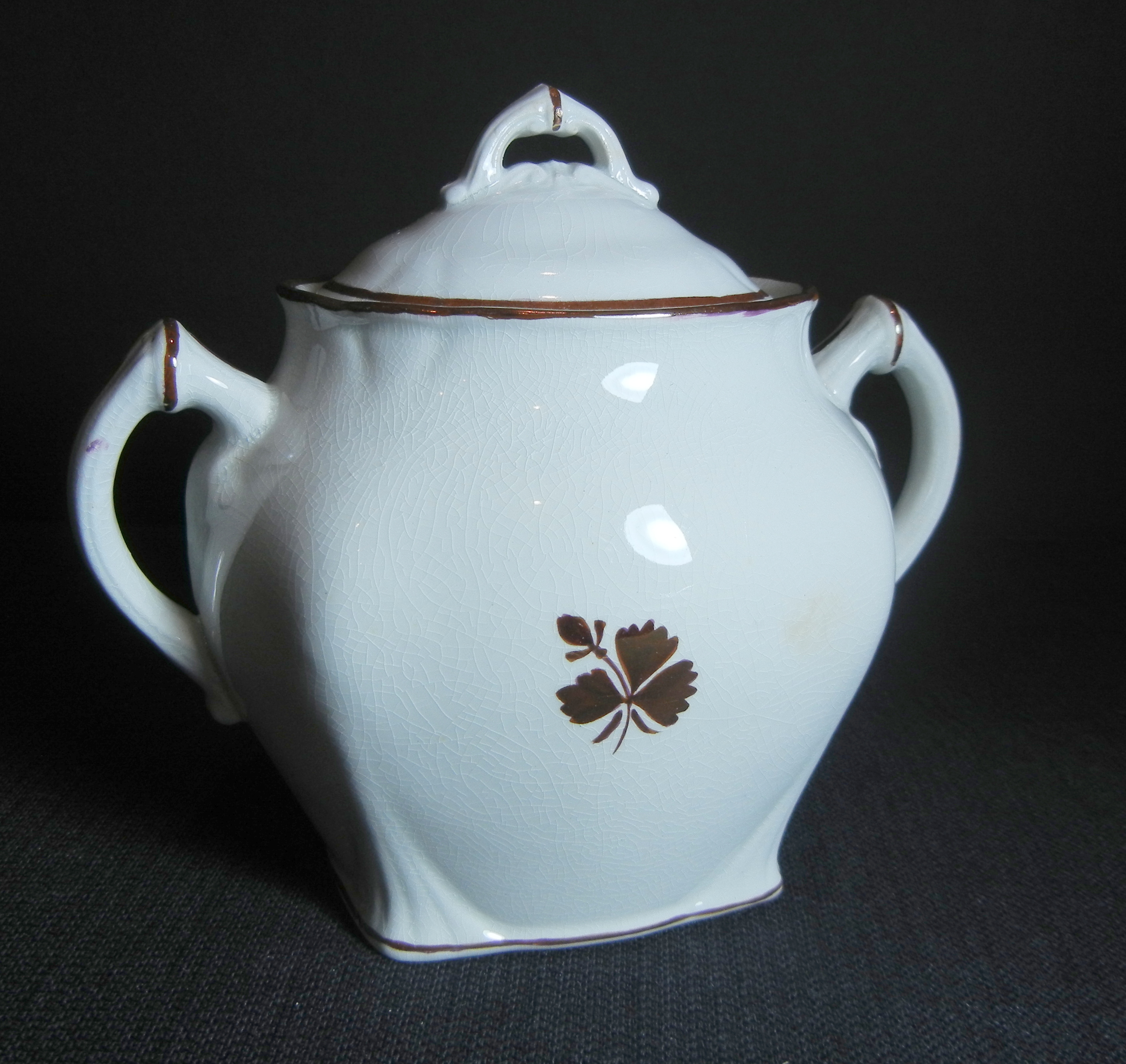 A sugar bowl in the Fleur-de-lys body style so named for the embossing at the finial, reminiscent of French chilvaric emblems.