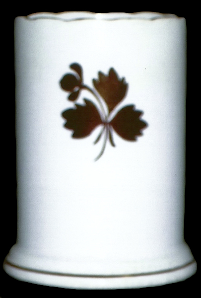 A Scalloped Rim shaped brush vase decorated with a large tea leaf motif that is indicative of a piece made by Mellor Taylor.