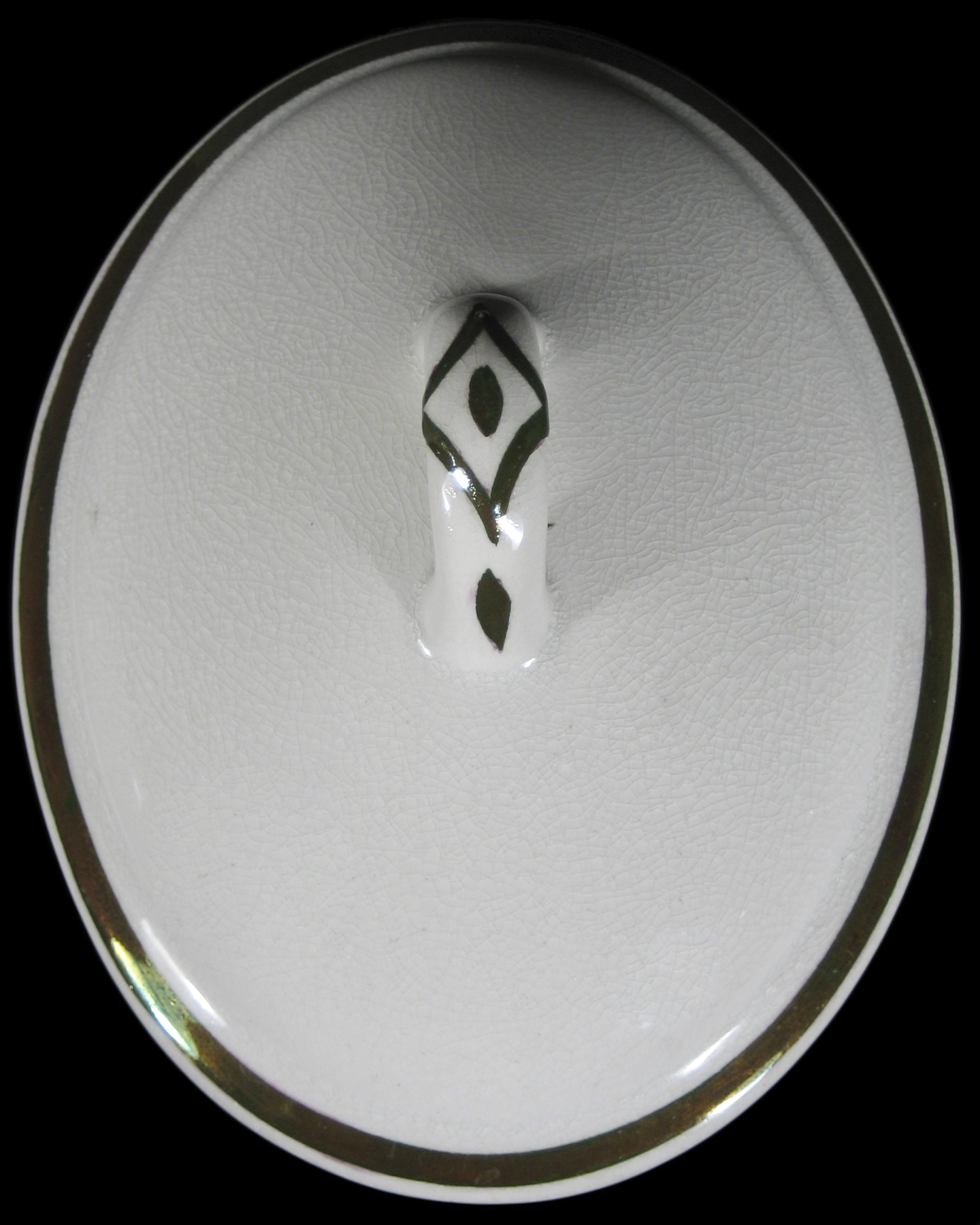 This is a top-down view of a lid from a soap dish in the Diamond Simplicity body style that clearly shows the lustre decorated embossed diamond on the finial that gives this body style its name. Note: the mark that is associated with this piece appears on the base not the lid.