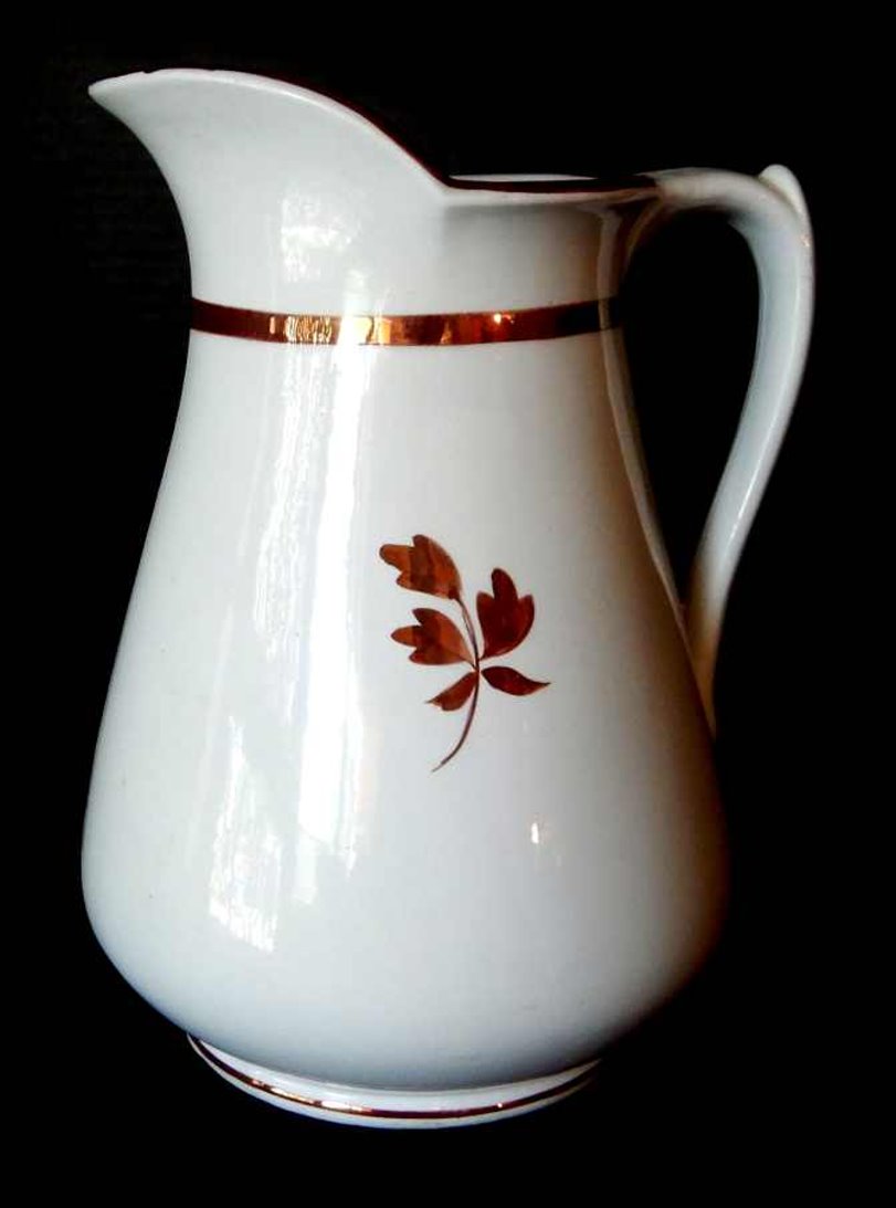 The tapered round body of this ewer is accentuated with thick copper lustre banding.  A matching basin or wash bowl would complete the set.